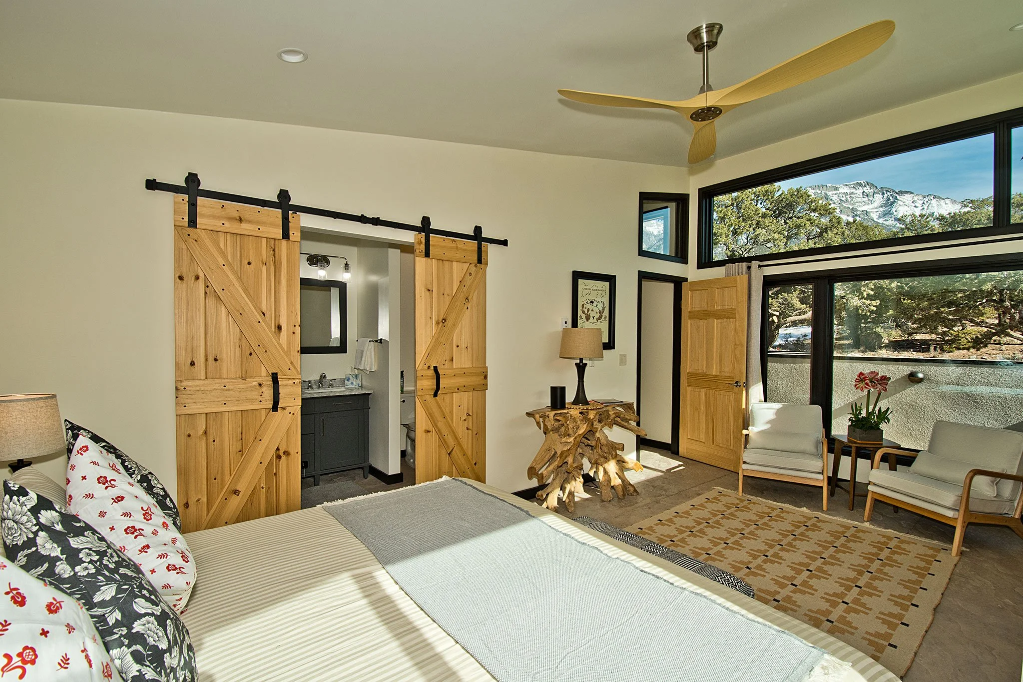 The Chalet is lovingly decorated with selections from local artists—light-filled and restorative—with drapes for nighttime privacy. You’ll also find a curated collection of books (including kids books), plus an entertainment cabinet stocked with Springbok puzzles and games. Settle in with premium seating, Sonos sound for easy music throughout your stay, high-quality linens, and a washer/dryer that makes longer trips painless. Pets are welcome, and we even keep doggie treats ready.